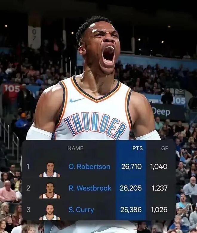 值得一提的是,目前威少NBA生涯總得分為26205分,暫時位列聯盟史上第20名,高居控衛位置第二名,僅落后頭名的奧斯卡-羅伯特森(26710)505分。