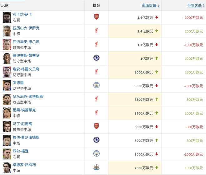 雷速體育10月17日訊 德轉更新英超最新身價:維爾茨跌至1.3億,凱塞多漲至1億,托納利漲至7500萬。